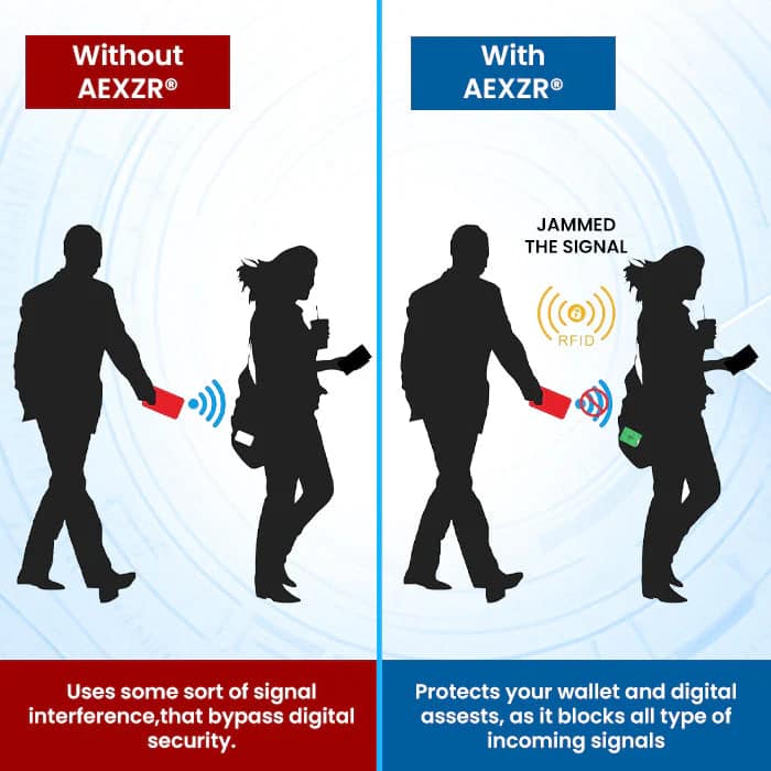 AEXZR Anti-RFID Guard Card shields your wallet from digital theft by blocking RFID/NFC scanners, offering instant, battery-free, invisible protection.
