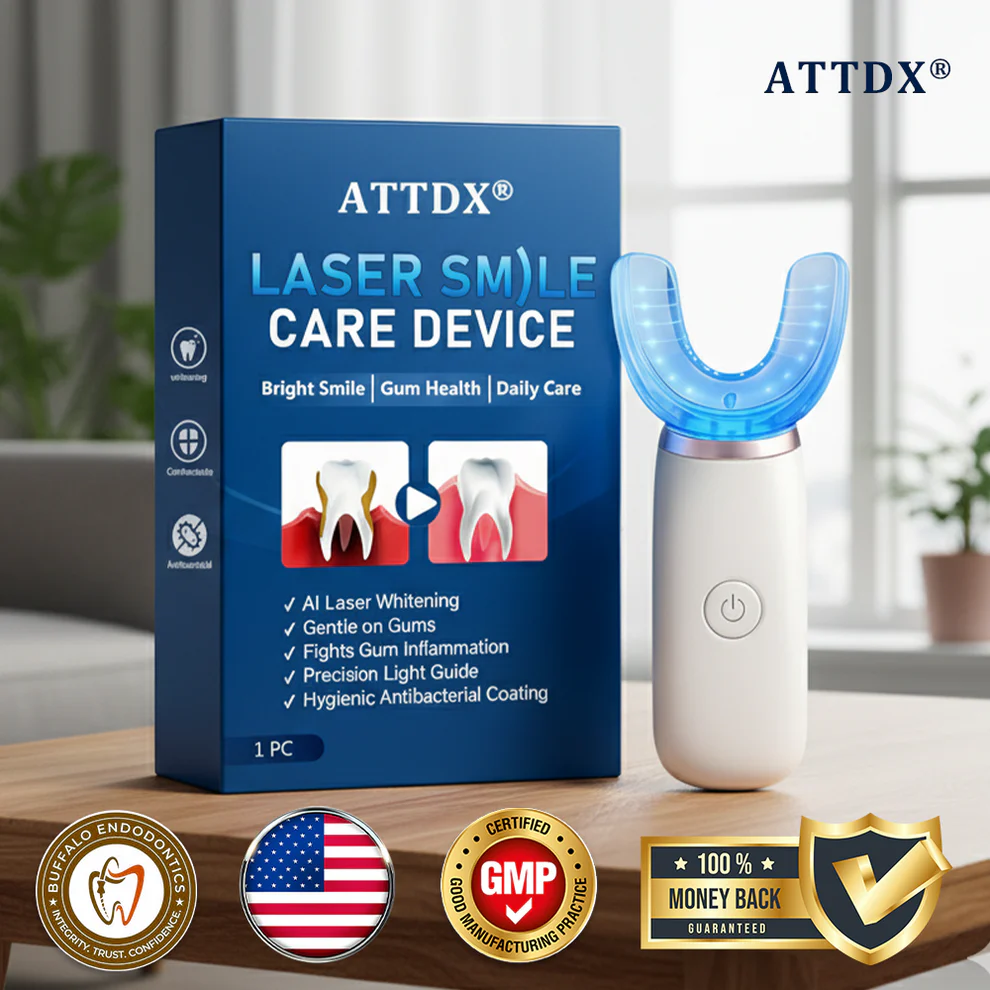ATTDX® Laser Smile Care Device whitens teeth in 10 minutes with dual-light tech, removing stains pain-free while improving gum health