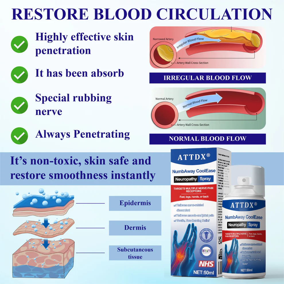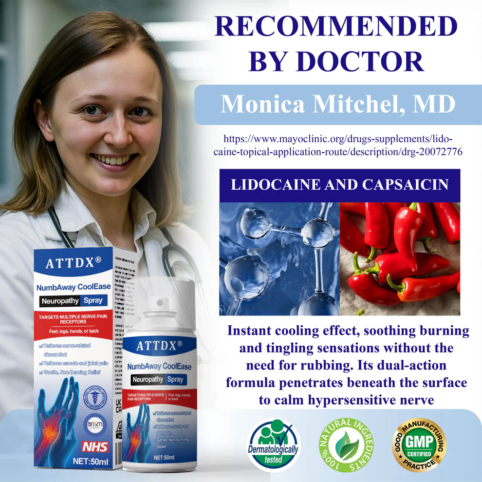 ATTDX® NumbAway CoolEase Neuropathy Spray eases burning, tingling, and nerve pain fast with Lidocaine, Capsaicin, and cooling relief for lasting comfort.