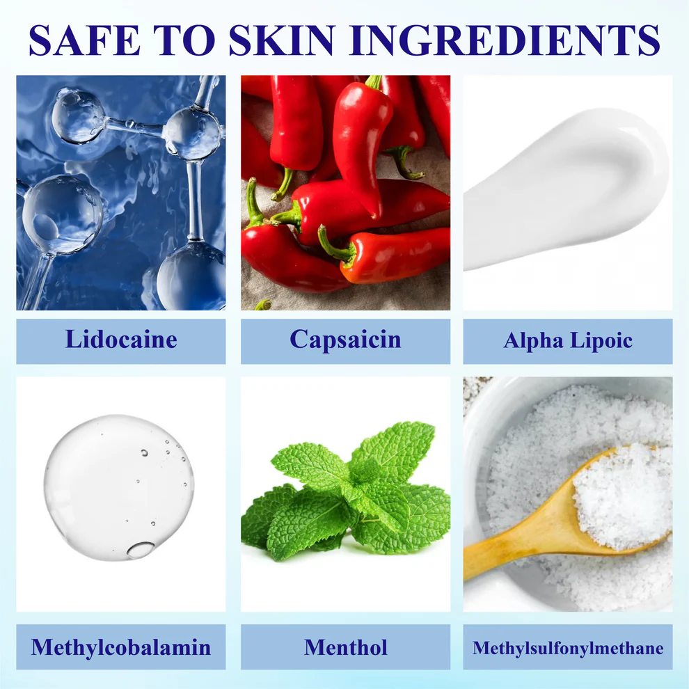 This medical-grade formula combines fast-acting Lidocaine and therapeutic Capsaicin for powerful, targeted relief. Lidocaine quickly blocks pain signals at the surface, while works deeper to calm overactive nerves. Together, they ease burning, tingling, and numbness without relying on steroids or harsh systemic medications.