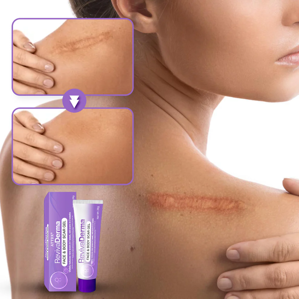 We are proud to introduce ATTDX® RevivaDerma Face & Body Scar Gel, a professional-grade skincare solution crafted for effective scar care. Its advanced formula is designed to visibly reduce the appearance of both new and old scars, including surgical scars, stretch marks, keloids, acne marks, burns, warts, skin tags, and varicose veins.