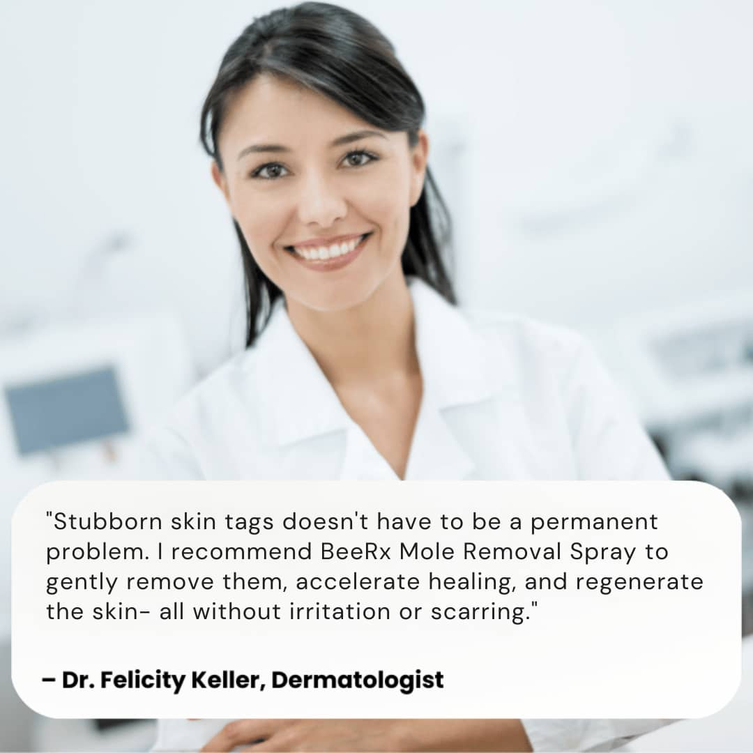 BeeRx Mole Removal Spray gently removes skin tags and warts fast, promotes natural skin regeneration, and restores smooth, healthy, flawless skin