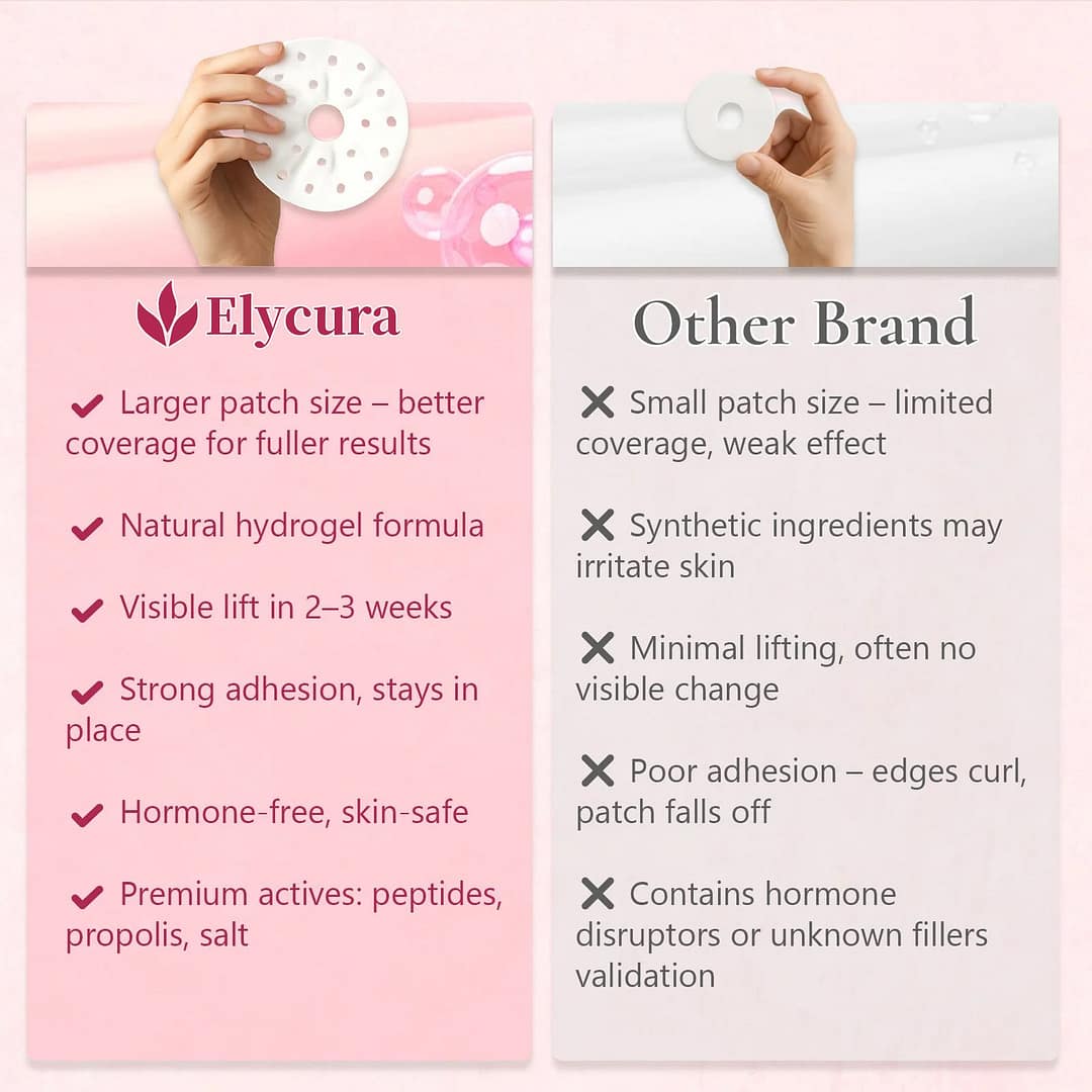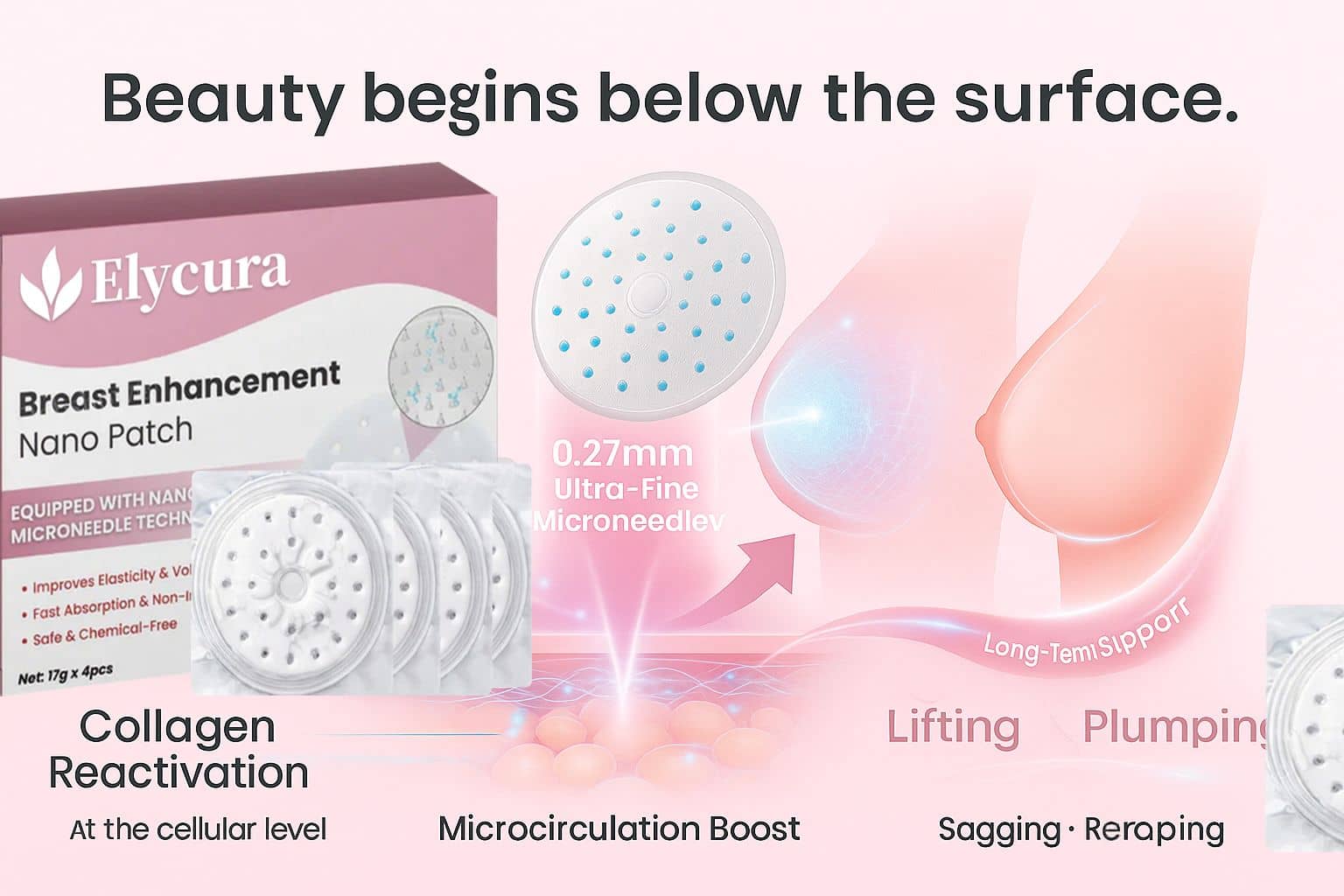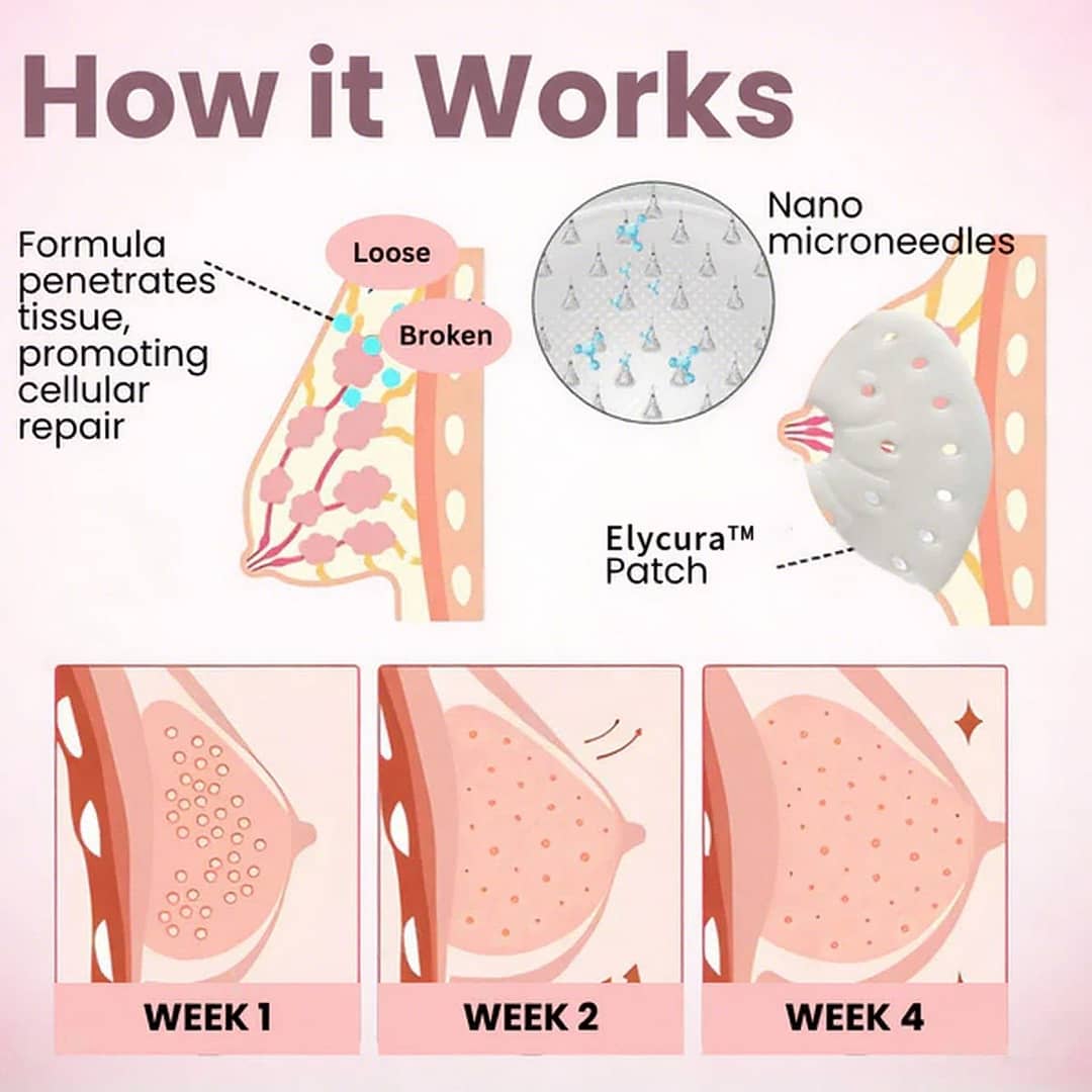 Elycura™ Nano Microneedle Breast Patch delivers deep, painless absorption of natural actives to lift, firm, and enhance breast shape safely and effectively