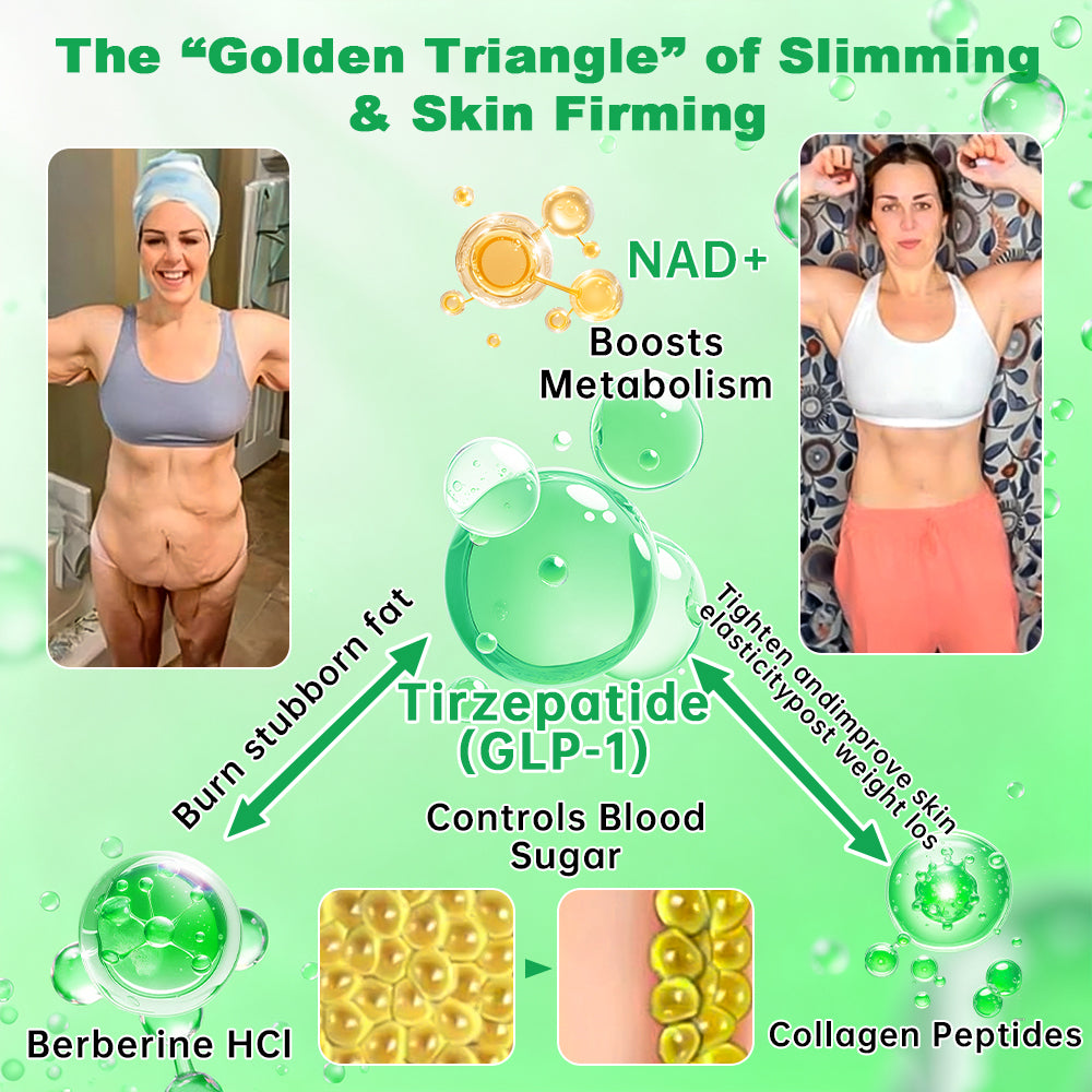 Collagen Peptides strengthen skin structure, reduce fine lines, and improve elasticity. NAD+/NMN stimulate cellular repair and collagen synthesis, while Omega-3 locks in moisture and improves skin smoothness. Green Tea Extract and Turmeric protect skin from oxidative stress and inflammation, slowing visible aging. Magnesium supports skin repair and hydration balance, while Silymarin provides detoxifying effects that brighten complexion. This synergistic formula helps lift sagging skin, smooth wrinkles, and restore a youthful glow after weight loss.