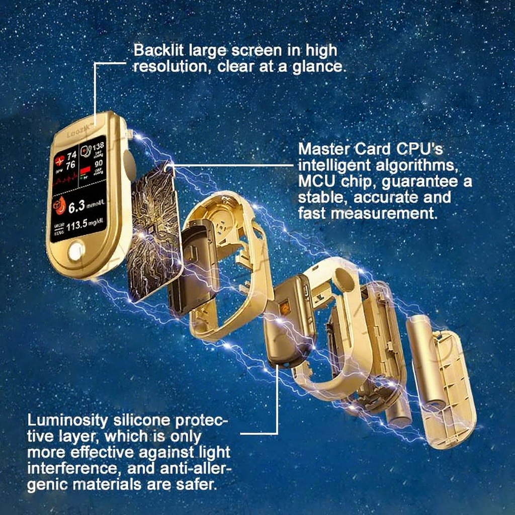 Laozik™’s latest innovation, the multifunctional non-invasive laser glucometer, integrates cutting-edge technologies for superior health monitoring. Equipped with a low-energy smart control chip and utilizing the advanced ‘LAMBERT BEER’ algorithm, this device ensures highly accurate measurements. It combines photon chip technology and silicon with light absorption spectroscopy to provide reliable, non-invasive monitoring of blood glucose, blood pressure, and blood oxygen levels. Certified by Health American, the device includes six display functions for easy and comprehensive health tracking. Whether you’re managing diabetes, monitoring cardiovascular health, or tracking oxygen levels, Laozik™ offers a reliable, all-in-one solution for your health needs.