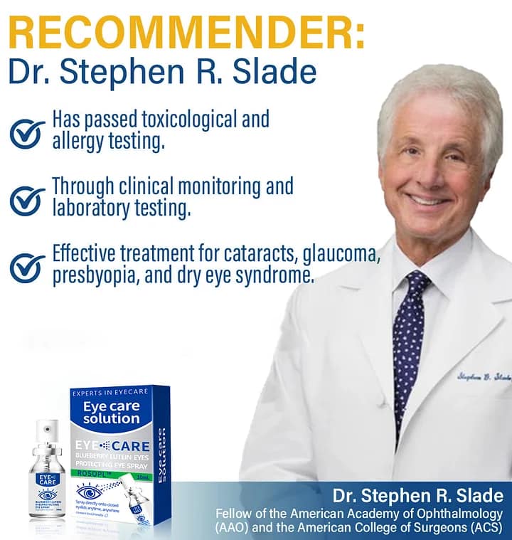 After four years of research, Dr. Stephen R. Slade and the American Academy of Ophthalmology have developed a revolutionary spray-type eye treatment for age-related vision problems. Unlike traditional drops, ROSOPL™ Blueberry Lutein Eye Spray delivers active ingredients in an ultra-fine mist, allowing them to be evenly absorbed by the eye surface – no irritation, no dripping, and no shedding. Clinical data from over 80,000 participants showed that 96% of users had clearer vision, and symptoms of presbyopia, cataracts, and dryness were significantly improved or eliminated.