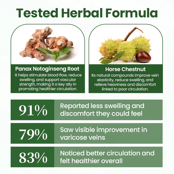 A: The formula features Panax Notoginseng Root for circulation, Horse Chestnut for vein health, and additional botanicals like Millettia Reticulata and Cuscuta Australis for soothing inflammation.