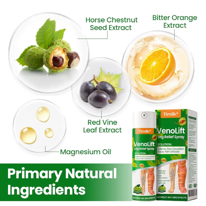 Timilk VenoLift Leg Relief Spray reduces swelling, heaviness, and fatigue by improving circulation, strengthening veins, and activating lymphatic drainage.