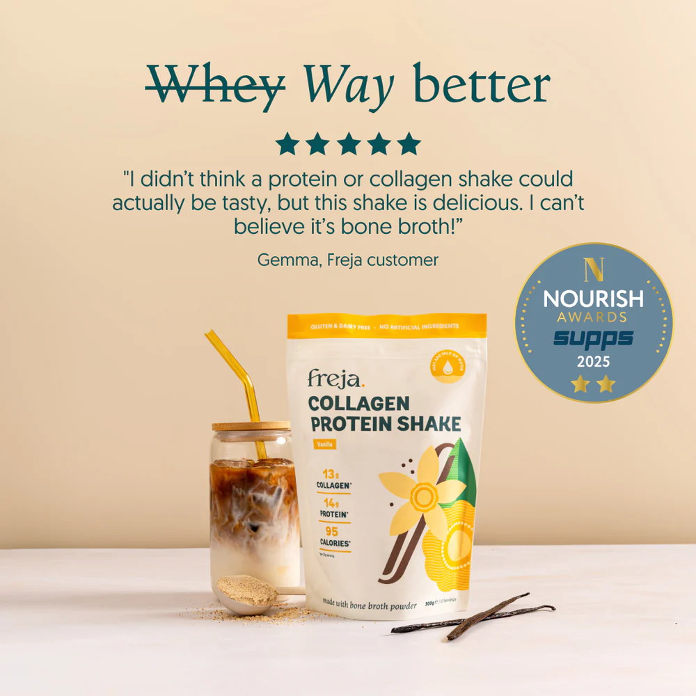 Freja Collagen Protein is made with just four natural ingredients your body can actually recognise and use. There are no artificial sweeteners, synthetic flavours, whey, stevia or unnecessary additives – just clean, simple nutrition that feels as good as it tastes.